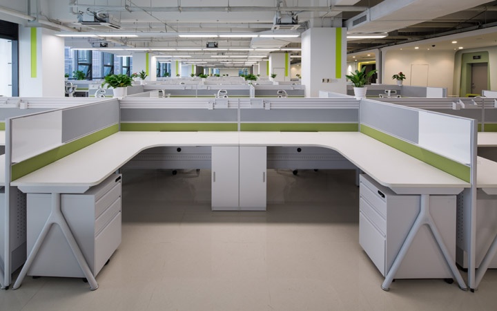 在空间布局上,通过兰斯工作站单排/双排以及120°灵活组合的方式让整个空间错落有致,再搭配蓝、绿、灰三色的贝格桌上屏风,不仅给员工提