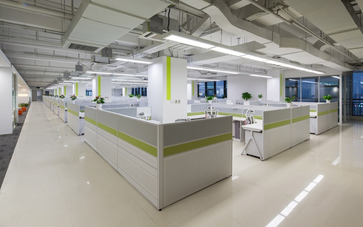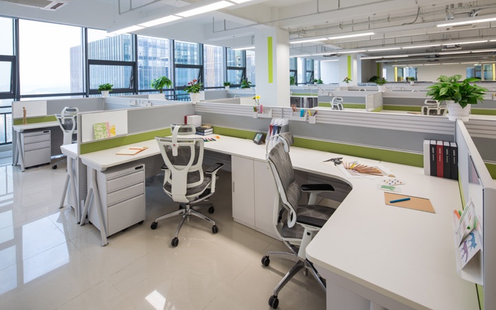 最值得一提的是色彩的运用,整个工程以白色为基调,大胆使用清新的蓝色和绿色,并运用侧屏风错落布置的方式,让整个办公空间充满清新